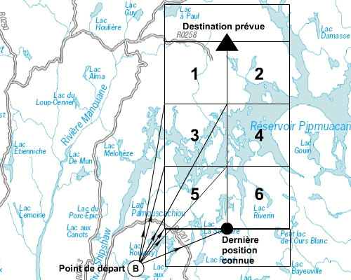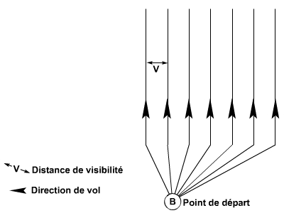Cette zone sera divisée en plusieurs secteurs ou carrés de recherche. Un point visuel ou électronique sera identifié comme point de départ de tous les pilotes pour leur secteur de recherche respectif. On l’appellera le point de mise en cap ou point de base.
