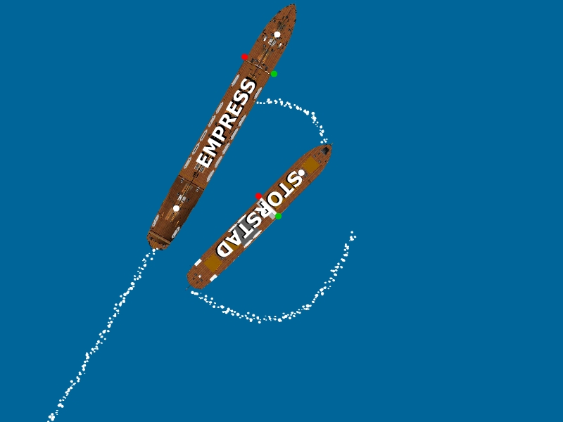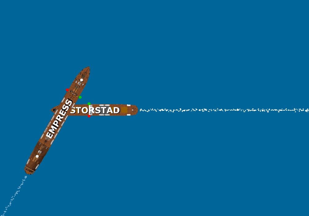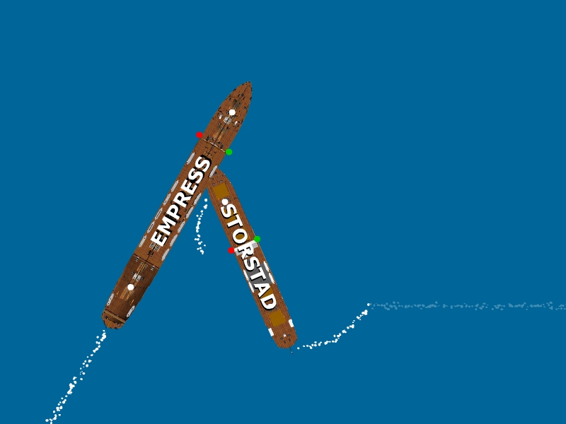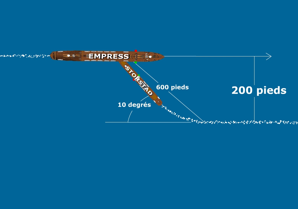 | " Le Storstad était entré un peu obliquement dans l'Empress par l’avant. " | " ... tournait sur la proue perpendiculairement à l’Empress... " | " ... venait presque toucher la poupe de l’Empress. " |