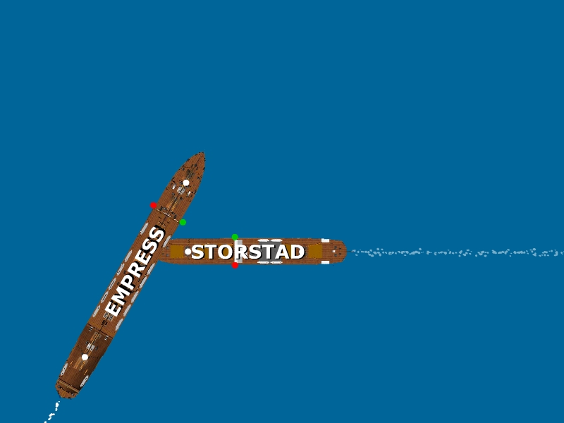 Par ailleurs, le Storstad était en accélération. D’immobile, on lui avait ordonné marche avant 1/3 (ou marche avant lentement). Si machine avant 3/3 faisait avancer le Storstad à 10 nœuds, alors avant 1/3 devait correspondre à une vitesse entre 1 et 3 nœuds. Retenons la plus rapide, 3 nœuds. Ce serait sa vitesse maximale lors de la collision, ce qui apparaît tout de même peu plausible compte tenu de sa masse et du temps à atteindre cette vitesse de déplacement. Mais bon, mettons 3 noeuds.