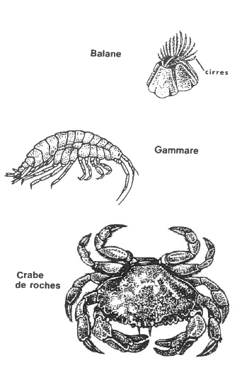 D'autres sont de taille plus appréciable, comme le Crabe de roches, dont on trouve quelquefois la carapace vide sur la plage. Rappelons en effet que la plupart des crustacés doivent pour grandir se départir périodiquement de leur carapace; c'est la mue. Certains en sont plus ou moins dépourvus, comme le Bernard l'ermite qui doit, pour se protéger, se cacher dans un quelconque coquillage.