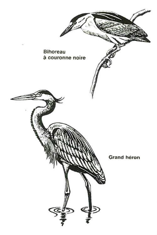 Très faciles à observer, il est opportun ici de les décrire brièvement afin de mieux les identifier. Chez le Grand héron, tout est en longueur; le bec, le cou, les pattes et les ailes. Cet oiseau est presque totalement gris-bleu, à l'exception de la tête blanchâtre et des aigrettes noires. Le Bihoreau est de taille plus modeste et a, quant à lui, les joues et le ventre blanchâtres, les ailes grises ainsi que le dessus de la tête et le dos noirs. On le dit plutôt nocturne et il est fréquent de le voir circuler, seul ou en petits groupes, au crépuscule. Il est cependant normal de l'apercevoir en plein jour. Notons que le Bihoreau juvénile arbore un plumage différent, aux rayures grises-brunes dominantes.