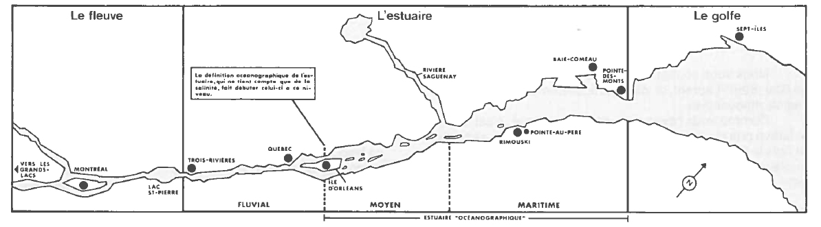 Comme l'estuaire présente lui-même des particularités différentes le long de son parcours, on l'a subdivisé en trois sections. La première est constituée d'eau douce; c'est l'estuaire fluvial, de l'amont du lac St-Pierre jusqu'à la région de Montmagny. La seconde voit débuter l'influence de la salinité; l'eau saumâtre de l'estuaire moyen coule de Montmagny jusqu'au niveau du Saguenay. De là, et jusqu'au golfe, c'est l'estuaire maritime, véritable petite mer intérieure. Parce qu'ils ne tiennent compte que de la salinité dans leur définition de l'estuaire, certains océanographes considèrent que celui-ci débute tout simplement à Montmagny, pour se terminer à Pointe-des-Monts.
