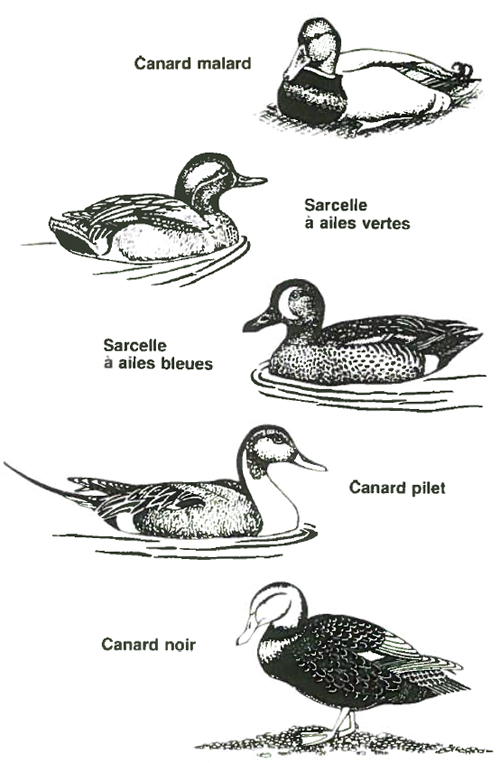 Ces canards se caractérisent par un envol presque vertical et le fait qu'ils ne plongent habituellement pas pour se nourrir. Ils s'alimentent de végétaux, par broutage ou filtration. On les rencontre régulièrement dans les habitats marécageux. Le Canard noir est sans contredit le plus caractéristique de ces milieux humides. Le mâle et la femelle sont semblables avec leur plumage brun marbré et le dessous des ailes blanc. La femelle du canard Malard peut être facilement confondue avec le Noir, parce que presque identique. Le mâle arbore cependant un plumage distinct, avec la tête d'un vert luisant. Aussi nicheur dans la région, le Pilet est moins abondant mais l'élégance sobre du plumage du mâle, avec les fins motifs de son cou et les longues plumes de sa queue, le rend très intéressant à l'observation. Les Sarcelles sont les plus petits canards rencontrés par ici. On distingue la Sarcelle à ailes vertes, avec sa tête brune et son "masque" vert, et la Sarcelle à ailes bleues, avec son croissant blanc sur la joue. Comme chez la plupart des oiseaux, les femelles se ressemblent beaucoup d'une espèce à l'autre. Elles sont donc moins repérables parce que mieux camouflées. N'ont-elles pas la responsabilité des jeunes!
