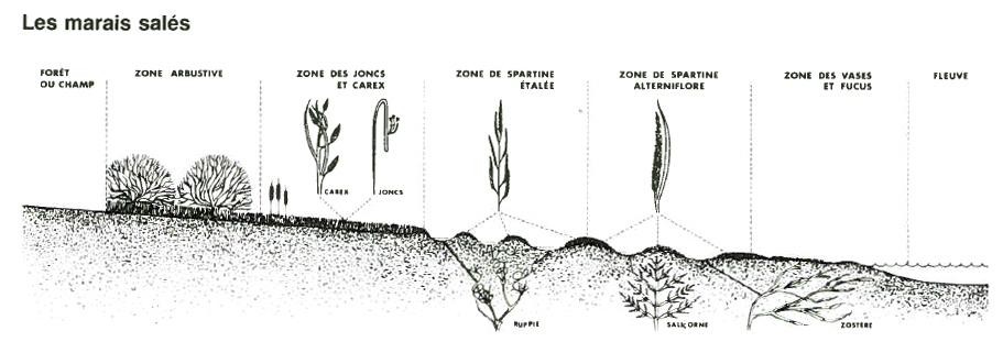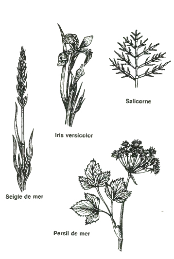 Certaines de ces plantes poussent dans la zone de balancement des marées, non loin des algues, et doivent donc tolérer l'immersion régulière. C'est le cas de la Spartine, plante maritime typique et très productive, qui contribue grandement à faire des marais salés les milieux naturels les plus riches qui soient, à l'échelle de la planète! On retrouve également dans ces habitats la Salicorne, assaisonnement fortement iodé des dîners des navigateurs d'autrefois, de même que la Zostère marine (ou arboutarde), nourriture très recherchée par les bernaches et jadis récoltée dans la région de l'lsle-Verte pour le rembourrage des matelas.