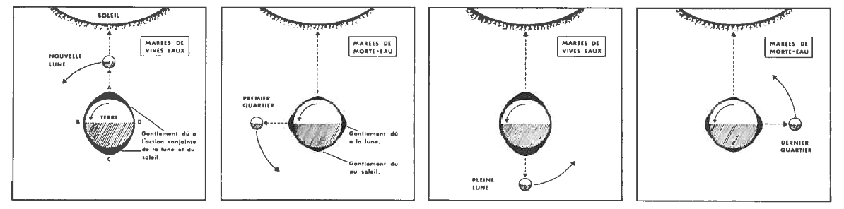 Le mouvement des marées suit donc la rotation de la lune, avec un léger décalage. À cause des curieux caprices des forces gravitationnelles, lorsque la marée est haute dans une région donnée (A), elle l'est également en son point opposé du globe (C). À ce moment, elle est basse aux points perpendiculaires (B et D).