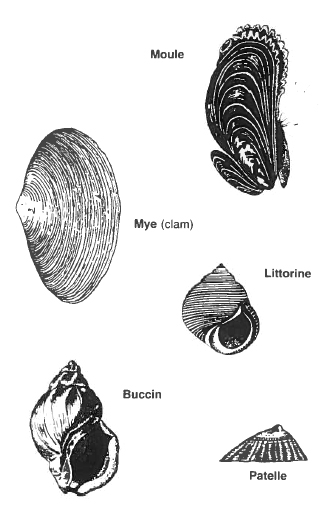 Les mollusques sont des animaux à corps mou, non segmenté et généralement enfermé dans une coquille calcaire. Les plus communs dans notre région appartiennent au groupe des bivalves (deux valves ou deux coquilles), comme la Moule, et des gastéropodes (mot qui signifie "estomac dans le pied"), comme le Buccin.