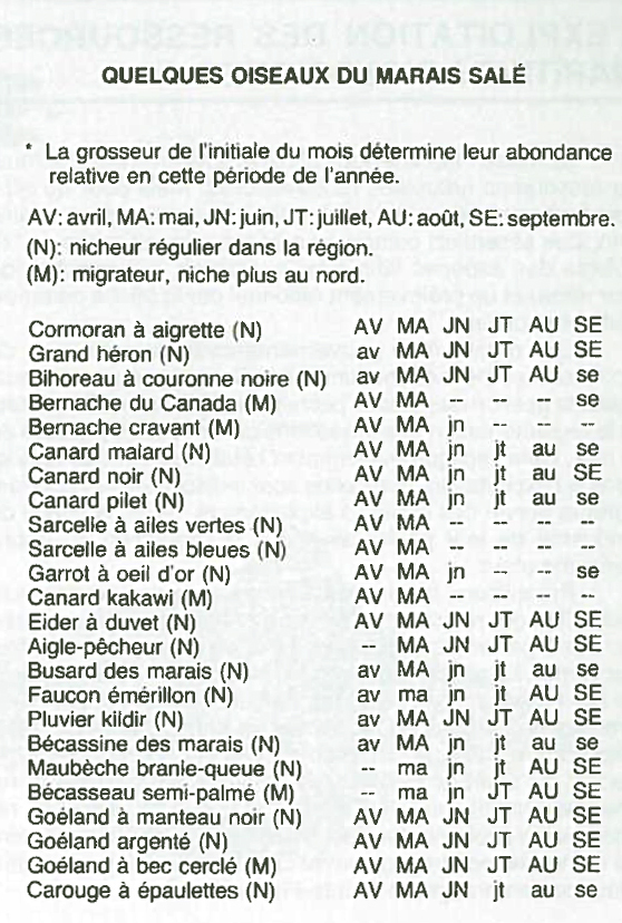 C'est cependant l'exploitation par les oiseaux qui demeure la plus remarquable. Lorsque libres de glace, les marais sont en effet l'objet d'une utilisation intensive par la faune avienne. Certaines espèces y nichent et y élèvent leurs jeunes (ex: Canard noir et Pilet) tandis que d'autres n'y viennent, toujours avec leur petite famille, que pour le repos, la protection et l'alimentation (ex: Eider à duvet, durant l'été).