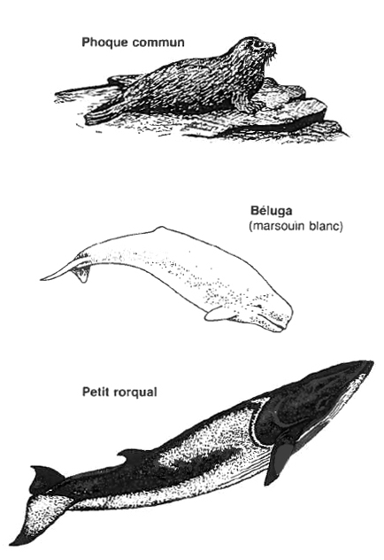 Moins apparents mais souvent plus spectaculaires, les mammifères marins de l'estuaire, baleines et phoques, ont développé des mécanismes physiologiques très perfectionnés d'économie d'oxygène et de conservation d'énergie pour se protéger de l'eau froide et être capable de plongées profondes et de longue durée.