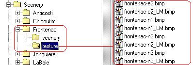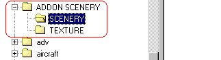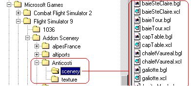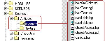 DOSSIER SCÈNES Trois répertoires de FS200X ont un rapport avec les scènes : SCENERY, ADDON SCENERY et TEXTURE. Le dossier SCENERY contient toutes les scènes par défaut de FS200X. Le dossier ADDON SCENERY accueille les scènes ajoutés en provenance d'Internet (quoiqu'on puisse aussi les placer dans le dossier SCENERY) et le dossier TEXTURE contient les textures de FS200X. Les dossiers SCENERY et ADDON SCENERY ADD-ON contiennent d'autres dossiers qui renferment à leur tour des dossiers SCENERY spécifiques. L'installation de scènes ajoutées ne touche habituellement que les dossier SCENERY et ADDON SCENERY. Dans FS2002 les scènes sont généralement ajoutées dans le dossier FS2002\SCENERY. Dans FS2004, elles le sont dans le dossier FS2004\ADDON SCENERY. Tous les fichiers de scènes (XXXXX.BGL) sont obligatoirement dans un dossier SCENERY. Tous les fichiers de texture de scène (XXXXX.BMP, XXXXX.R8 etc.) sont obligatoirement dans le dossier TEXTURE adjacent. Des problèmes d'affichage surviendront lorsque le fichier BGL ne trouve pas sa texture correspondante ; c'est pourquoi il est important de vérifier la présence de textures dans tout téléchargement de scène. Dans certains cas les couleurs de structures la scène seront générées par le système ; il n'y aura donc pas de fichiers texture attachés à cette scène (ex : le voilier sur la photo de la mission Galère Tahitienne n'a aucune texture d'accompagnement). Que