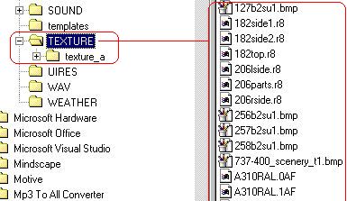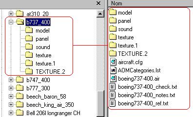 en une seule opération. DOSSIER AVIONS (exemple de FS2002). Le dossier AIRCRAFTS de FS200X contient tous les avions que vous pouvez piloter dans le simulateur. Qu'il y soit par défaut ou qu'il soit importé, chaque dossier d'avion possède la même structure de base. 1. Dossier PANEL (le tableau de bord ; module principal, commandes, radio, radar etc.) Contenu : Pour plusieurs avions importés, ce dossier ne comporte pas de fichiers-images. PANEL.CFG pointe alors vers le tableau de bord d'un appareil par défaut de FS200X. C'est ainsi qu'on pourra avoir le TDB du Learjet dans un Challenger, celui du Baron dans un Otter et ainsi de suite. On peut faire pointer le le fichier PANEL.CFG vers le TDB d'un autre appareil en éditant la ligne de code. Plusieurs sites offrent le téléchargement de TDB spécifiques à tel ou tel appareil. On peut également remplacer le dossier PANEL, sans autre modification, par celui d'un autre appareil, contenant le TDB désiré (prendre alors soin de sauvegarder le dossier PANEL original). 2. Dossier SOUND (le son de l'appareil ; moteurs, cockpit etc.) Contenu : Pour plusieurs avions importés, ce dossier ne comporte pas de fichiers-son, SOUND.CFG pointe alors vers le son d'un appareil par défaut de FS200X. C'est ainsi qu'on pourra avoir le son du Learjet pour un Challenger, celui du Baron pour un Otter et ainsi de suite. On peut faire pointer le le fichier SOUND.CFG vers les sons d'un autre appareil en éditant la ligne de code. Plusieurs sites offrent le téléchargement de sons spécifiques à tel ou tel appareil. On peut également remplacer le dossier SOUND, sans autre modification, par celui d'un autre appareil, contenant les sons désirés (prendre alors soin de sauvegarder le dossier SOUND original). 3. Dossier TEXTURE (les textures de l'appareil) Contenu : Ce dossier ne contient pas de fichier de configuration, entre autres parce qu'il ne peut pointer vers les textures d'un autre appareil. Il arrive souvent que des designers modifient les textures d'un appareil sans toucher au modèle en tant que tel. Dans ce cas, on peut remplacer le dossier TEXTURE par celui contenant les textures désirées (prendre alors soin de sauvegarder le dossier TEXTURE original) ; soyez alors absolument certains que les modèles sont IDENTIQUES, sinon les textures s'appliqueront bizarrement. Il arrive aussi que les modèles des avions téléchargés soient d'une version antérieure à votre FS200X, tout en étant compatible ; les fichiers texture pourront alors être de format différent (ex : XXXXX.0AF). 4. Dossier MODEL (le modèle de l'appareil) Contenu : Ce modèle a été créé grâce un éditeur de structures 3D (ex : Gmax) qui a aidé le concepteur à dessiner et construire l'avion. Ce fichier ne peut être modifié directement. 5. Dossier RACINE de l'appareil Contenu : Ces fichiers contiennent la configuration de l'appareil, notamment les caractéristiques aérodynamiques de l'appareil (vitesse, portance, poids, carburant etc), les informations contenues dans l'affichage de la fenêtre ATC, les liens vers les dossiers PANEL, SOUND et TEXTURE. Le fichier XXXX.AIR peut être modifié, mais selon des précautions extrêmes (et toujours conserver l'original). 6. Autres fichiers Les téléchargements d'appareils peuvent comporter des fichiers supplémentaires, comme dans le cas où des jauges spécifiques sont nécessaires pour le tableau de bord. Il faut alors copier ces fichiers XXXXX.GAU dans le dossier GAUGES de FS200X (il arrive alors très souvent que les jauges y soient déjà ; par précautions, on refuse alors le collage). Dans de plus rares cas, des fichiers d'effets accompagnent les téléchargements (ex: fumée d'avion acrobatique) ; il faut alors coller ces fichiers XXXXX.FX dans le dossier EFFECTS de FS2002X. DANS TOUS LES CAS il est important de bien lire les fichiers d'accompagnement qui contiennent toutes les informations sur l'installation et le pilotage de l'appareil (généralement un LISEZ-MOI.TXT ou un README.TXT). Voici à quoi ressemble un dossier d'un avion du répertoire AIRCRAFT.